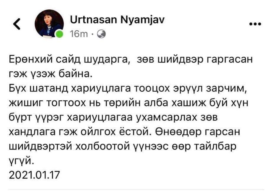 Тэгвэл Байгаль орчин, аялал жуулчлалын сайд Н.Уртнасан өөрийн цахим хуудаснаа байр сууриа илэрхийлсэн байна.
