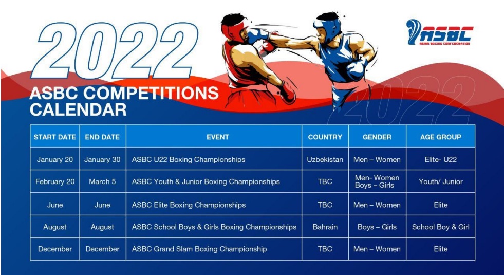 Азийн боксын холбооноос (ASBC) 2022 онд зохион байгуулах тэмцээн уралдааны хувиараа танилцууллаа. Тэмцээний шинэ улирал Узбекистаны нийслэлд энэ сарын 20-30-нд явагдах 22 хүртэлх насны Ази тивийн аварга шалгаруулах боксын тэмцээнээр эхлэж байна.