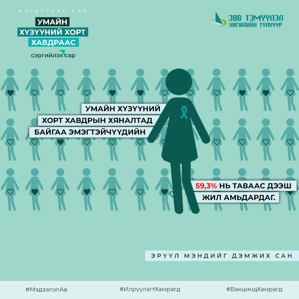 Энэ нэгдүгээр сарыг "Умайн хүзүүний хорт хавдраас сэргийлэх сар" болгон зарласан билээ. Монгол Улсын хэмжээнд умайн хүзүүний хорт хавдрын хяналтад байгаа эмэгтэйчүүдийн 59.3 хувь нь таваас дээш жил амьдардаг гэсэн судалгаа гарчээ.
