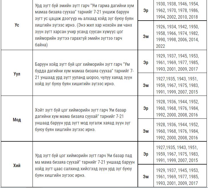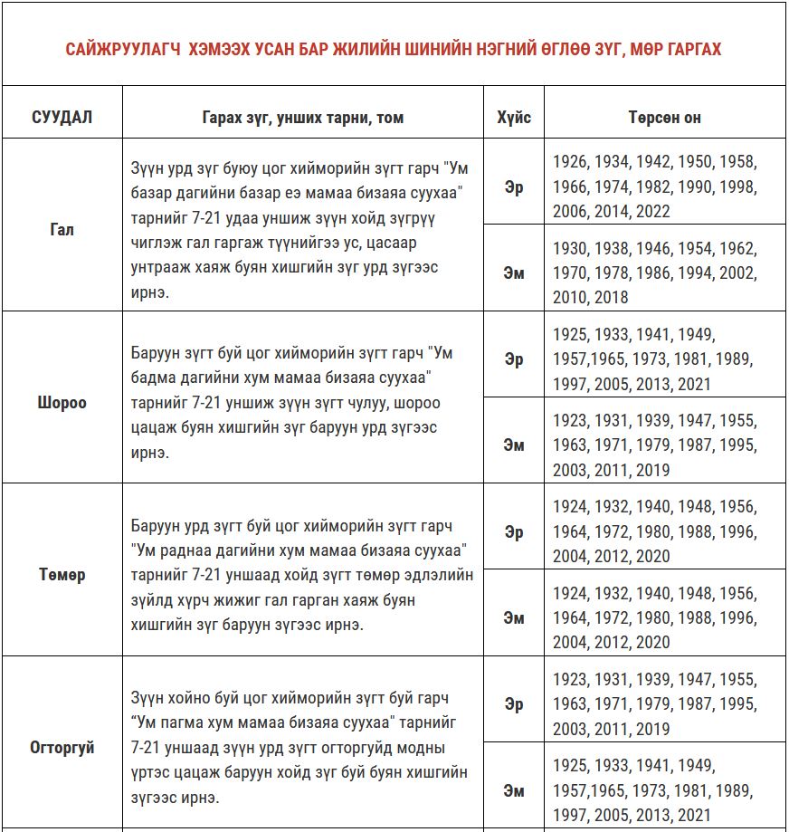 УУЛ: Чулуу, уул хад эвдлэх хийгээд мод чулууны үйлийг тэвч. Нүдэт яр, чигаа, хамуу, халдварт өвчин ирэх. Жадамба, Цагааншүхэрт, Довучи-до, Ханчиннагва, Сац талби.