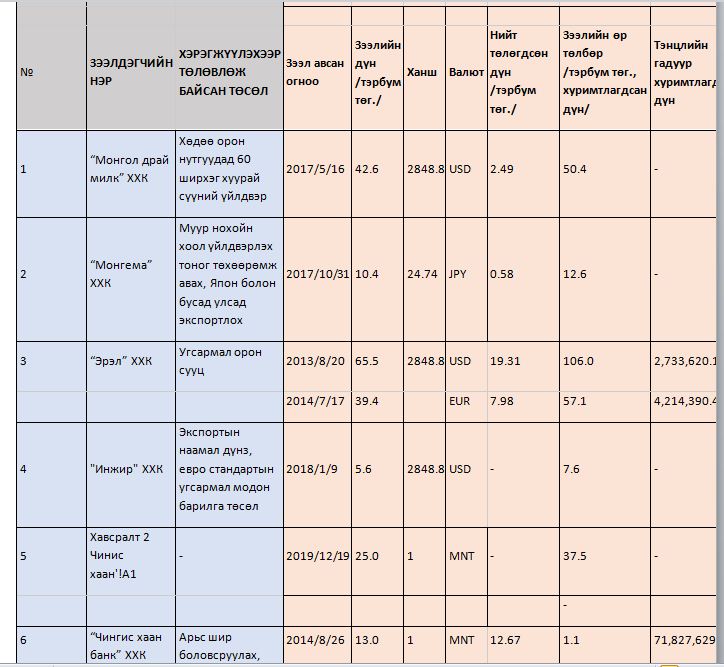 Шүүхээр шийдвэрлүүлэхээр нэхэмжлэл гаргасан 26 чанаргүй зээл, активын мэдээлэлд зээлийн зориулалт, зээл, актив хөрөнгийн талаарх мэдээлэл болон шүүх, шийдвэр гүйцэтгэлийн шатууд дахь мэдээллийг ил болголоо гэсэн байгаа юм.