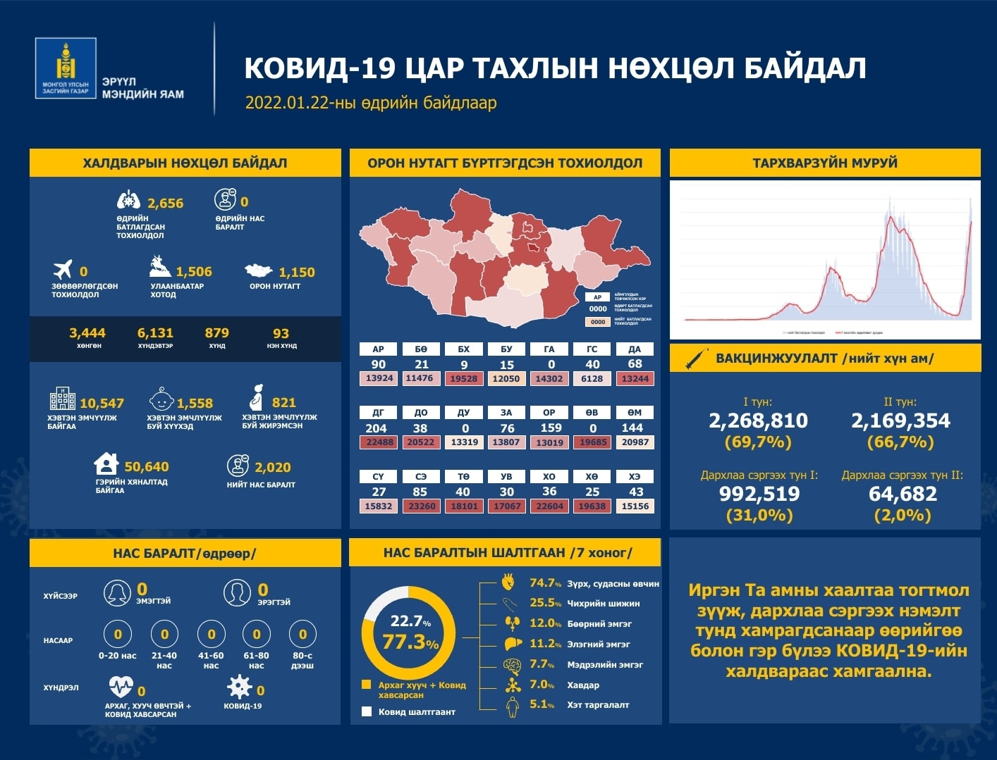 Монгол Улсын хэмжээнд сүүлийн 24 цагт "Ковид-19" халдварын 2656 шинэ тохиолдол батлагджээ. Үүнээс 1506 нь Улаанбаатар хотод, 1150 нь орон нутагт бүртгэгдсэн байна.