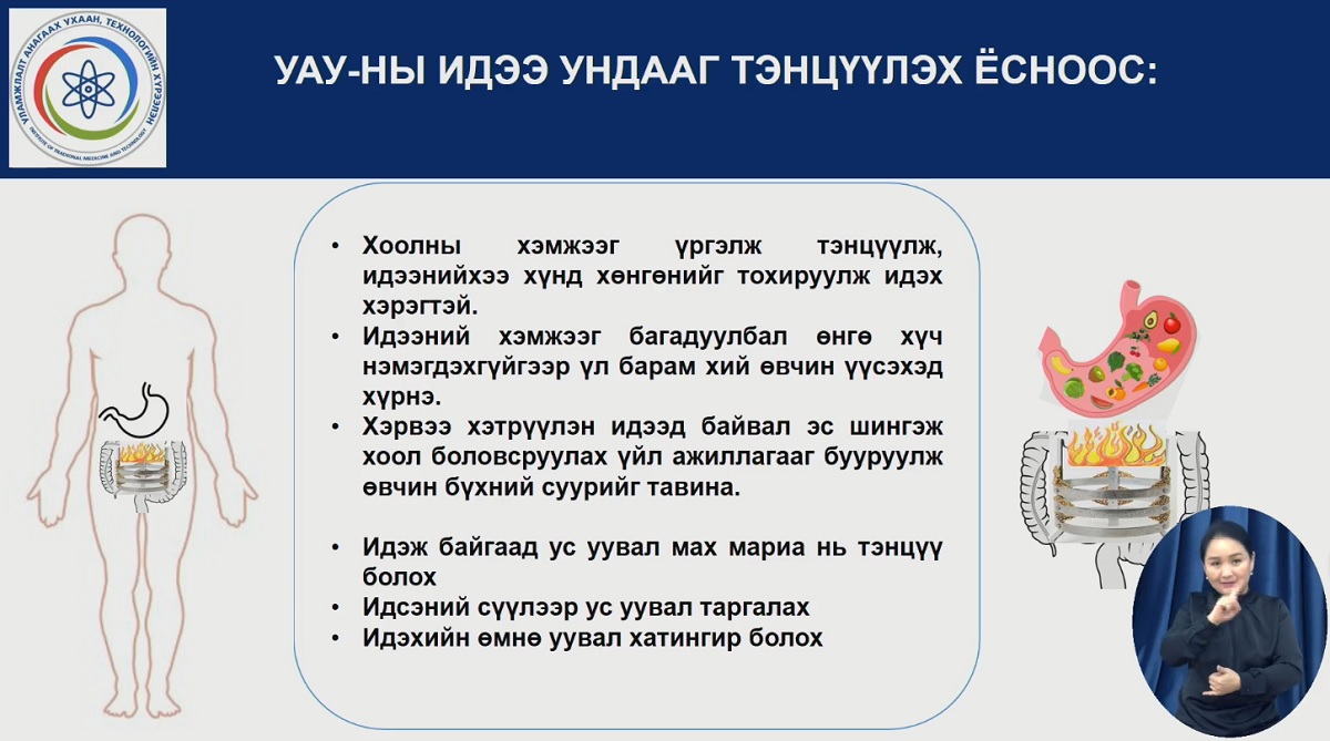Ковидоор өвдчихсөн үед эм болон заслын эмчилгээг анхаарсаар байгаа. Тэгвэл идээ, ундаа, явдал мөрийн эмчилгээ гэдэг нь нэгдүгээрт өвчнөөс урьдчилан сэргийлэх, эрүүл байх, эрүүл өтлөх боломж. Хоёрдугаарт өвчний үед хоол унд, дадал үйлээ зөв байлгаснаар өвчнийг хурдан дарах, өвчлөлийн дараа хоол унд, явдал мөрийг зөв байлгаснаар өвчний сүүлийг таслах, хурдтай эдгэрэх арга хэмжээ авах ач холбогдолтой.