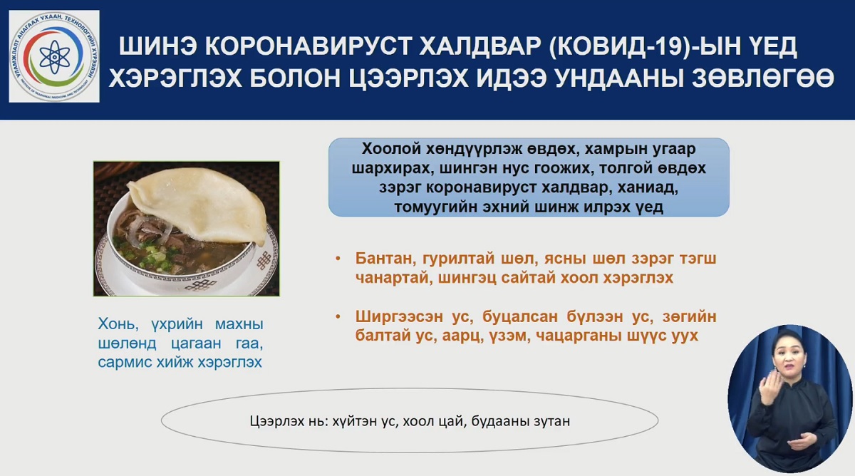"Ковид-19" ба Уламжлалт анагаах ухаан сэдвийн хүрээнд Уламжлалт анагаах ухаан, технологийн хүрээлэнгийн эмнэлэг /УАУТХЭ/-ийн Тэргүүлэх зэргийн эмч Г.Жаргалсайхан дараах зөвлөмж, зөвлөгөөг өглөө.