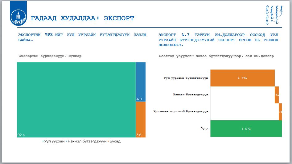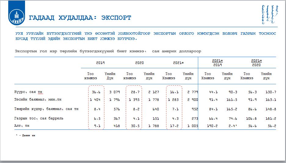 Тэгвэл УУХҮЯ-наас өчигдөр өгсөн мэдээлэлдээ, Цар тахлын нөхцөл байдал уул уурхайн бүтээгдэхүүний экспортод сөргөөр нөлөөлж байгаа ч экспортын бүтээгдэхүүний үнийн өсөлт, хариу арга хэмжээний үр дүнд эрдэс баялгийн салбараас улсын төсөвт оруулж буй орлого өсөлттэй буюу 2021 оны төсвийн орлогын 30 орчим хувийг бүрдүүллээ хэмээн тодотгон мэдээлэв.