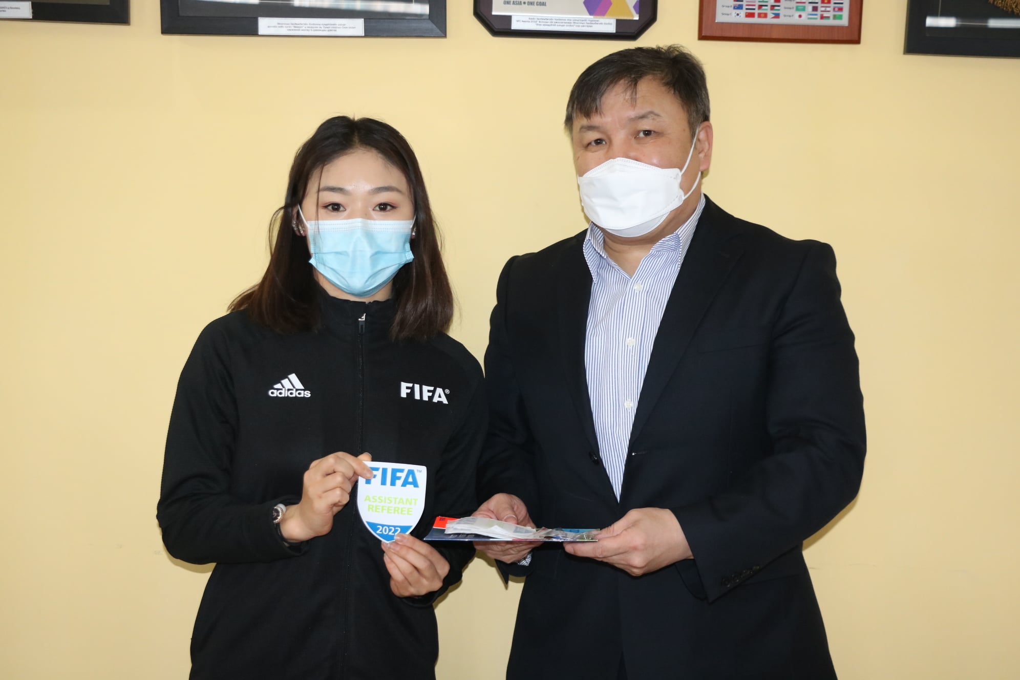 Монголын Хөлбөмбөгийн Холбооны ЕНБД Д.Тэрбаатар, Спортын мастер ахмад хөлбөмбөгчин Р.Бадамдорж болон Шүүгчийн хэлтсийн дарга Д.Түмэнбаяр нар 2022 оны ОУХБХ-ны шүүгчдийг хүлээн авч уулзаж энгэрийн тэмдэг болон үнэмлэхийг гардуулан өглөө.