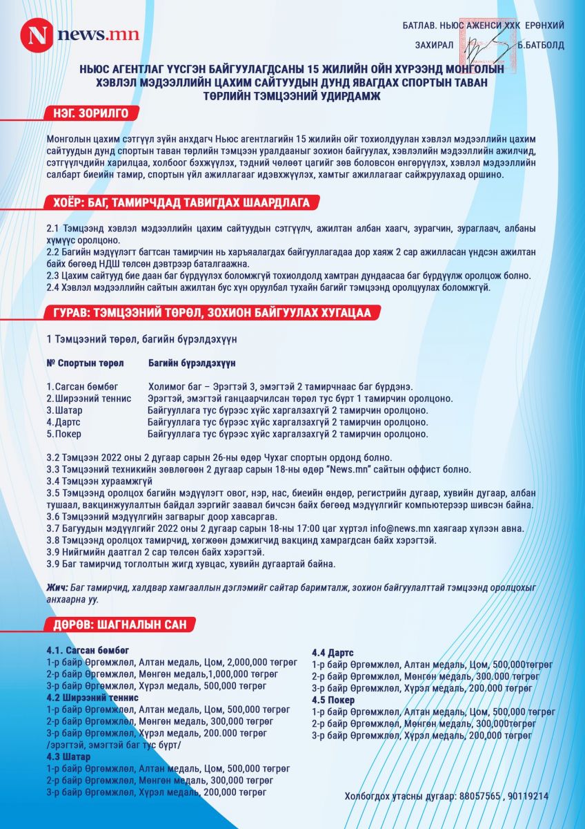 Тодруулбал, тэд 15 жилийн ойн хүрээнд хэвлэл мэдээллийн салбартаа чиглэсэн олон арга хэмжээ зохион байгуулахаар төлөвлөсөн бөгөөд цахим мэдээллийн сайтуудынхаа дунд “News-15” спортын наадмыг 2022 оны хоёрдугаар сарын 26-ны өдөр зохион байгуулахаар болжээ.