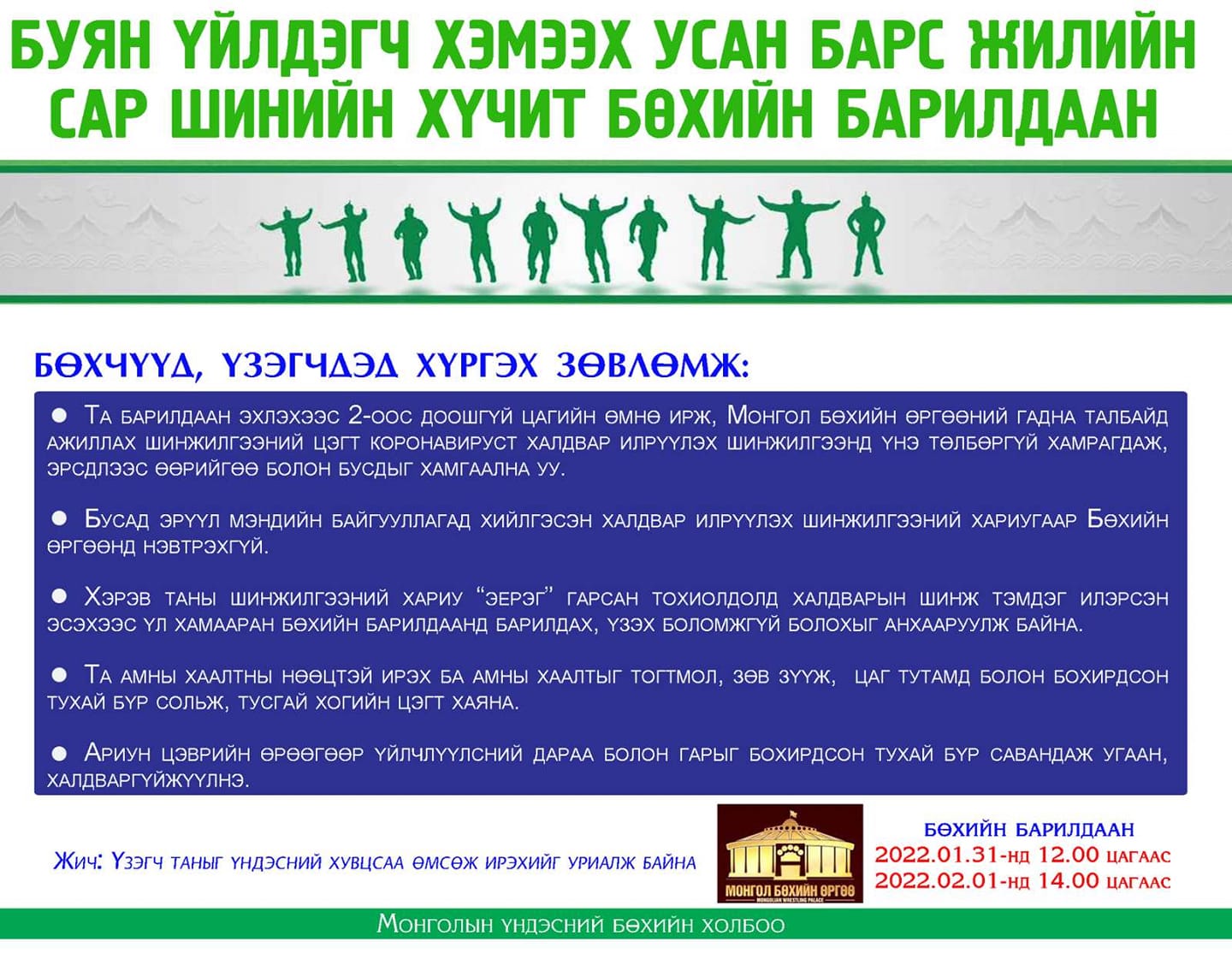 Усан бар жилийн Сар шинийн хүчит бөхийн барилдаан болохтой холбогдуулан бөхчүүд болон үзэгчдэд дараах зөвлөмжийг хүргэж байна.