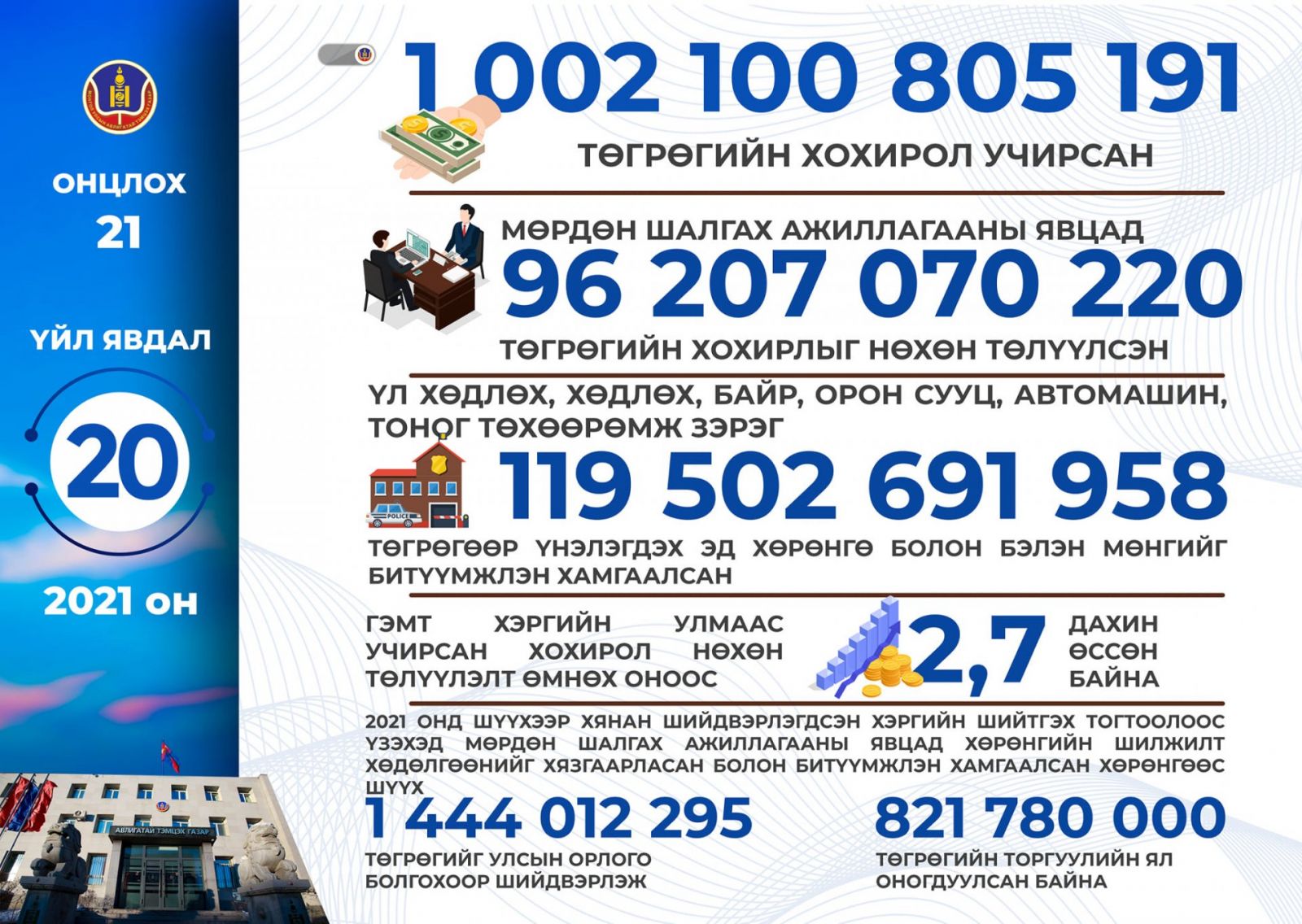 Өнгөрөгч 2021 онд шалгасан гэмт хэргийн улмаас 1,002,100,805, 191 /нэг их наяд, 2 тэрбум, нэг зуун сая, найман зуун таван мянга нэг зуун ерэн нэг/ төгрөгийн хохирол учирснаас мөрдөн шалгах ажиллагааны явцад 96,207,070,220 /ерэн зургаан тэрбум, хоёр зуун долоон сая, далан мянга, хоёр зуун хорь/ төгрөгийн хохирлыг нөхөн төлүүлж, үл хөдлөх, хөдлөх, байр, орон сууц, автомашин, тоног төхөөрөмж зэрэг 119,502,691,958 /нэг зуун арван есөн тэрбум, таван зуун хоёр сая, зургаан зуун ерэн нэгэн мянга, есөн зуун тавин найм/ төгрөгөөр үнэлэгдэх эд хөрөнгө болон бэлэн мөнгийг битүүмжлэн хамгаалсан байна.