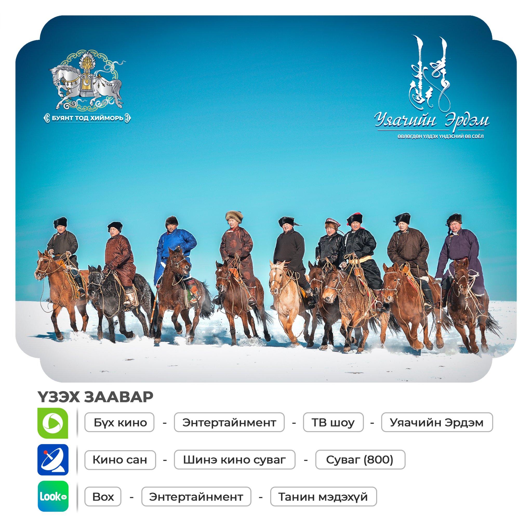 Адууны ивээл Сайжруулагч хэмээх Усан бар жилийг угтаж “Буянт Тод Хийморь” ХХК-с “Уяачийн Эрдэм” реалити нэвтрүүлгийг Морьтон Монголчууддаа зориулан бэлтгэж байна. Энэхүү нэвтрүүлгээр энэ цаг үед улс, бүсийн уралдаануудад хүлэг морьдоо тогтмол амжилттай уяж түрүү, айрагтай тэгшхэн сайхан наадаж байгаа МУТМУ, МУМУ, МУАУ болон 90-ээд оны уяач нарын төлөөлөл болсон залуучууд хүлэг морьдынхоо уяа сойлгыг хэрхэн тааруулдаг талаар хүргэнэ.