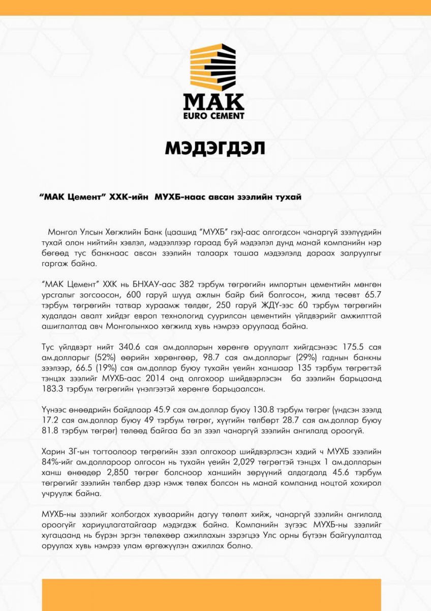 "МАК цемент" ХХК Хөгжлийн банкнаас зээлийн талаар МЭДЭГДЭЛ гаргажээ.