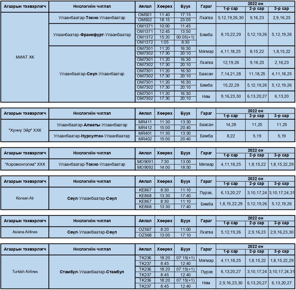 Иргэний нисэхийн ерөнхий газраас 2022 оны эхны улиралд үйлдэх олон улсын нислэгийн хуваарийг гаргажээ. Тодруулбал, Токио, Франкфурт, Сөүл, Алматы, Нурсултан хотууд руу хуваарийн дагуу нислэг үйлдэнэ.