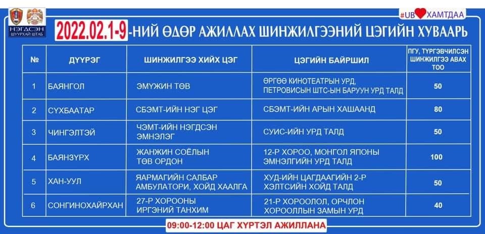 Сар шинийн баярын өдрүүдэд буюу хоёрдугаар сарын 01, 02, 03-ны өдөр ажиллах шинжилгээний цэгүүд болоод цагийн хуваарийг хүргэж байна.