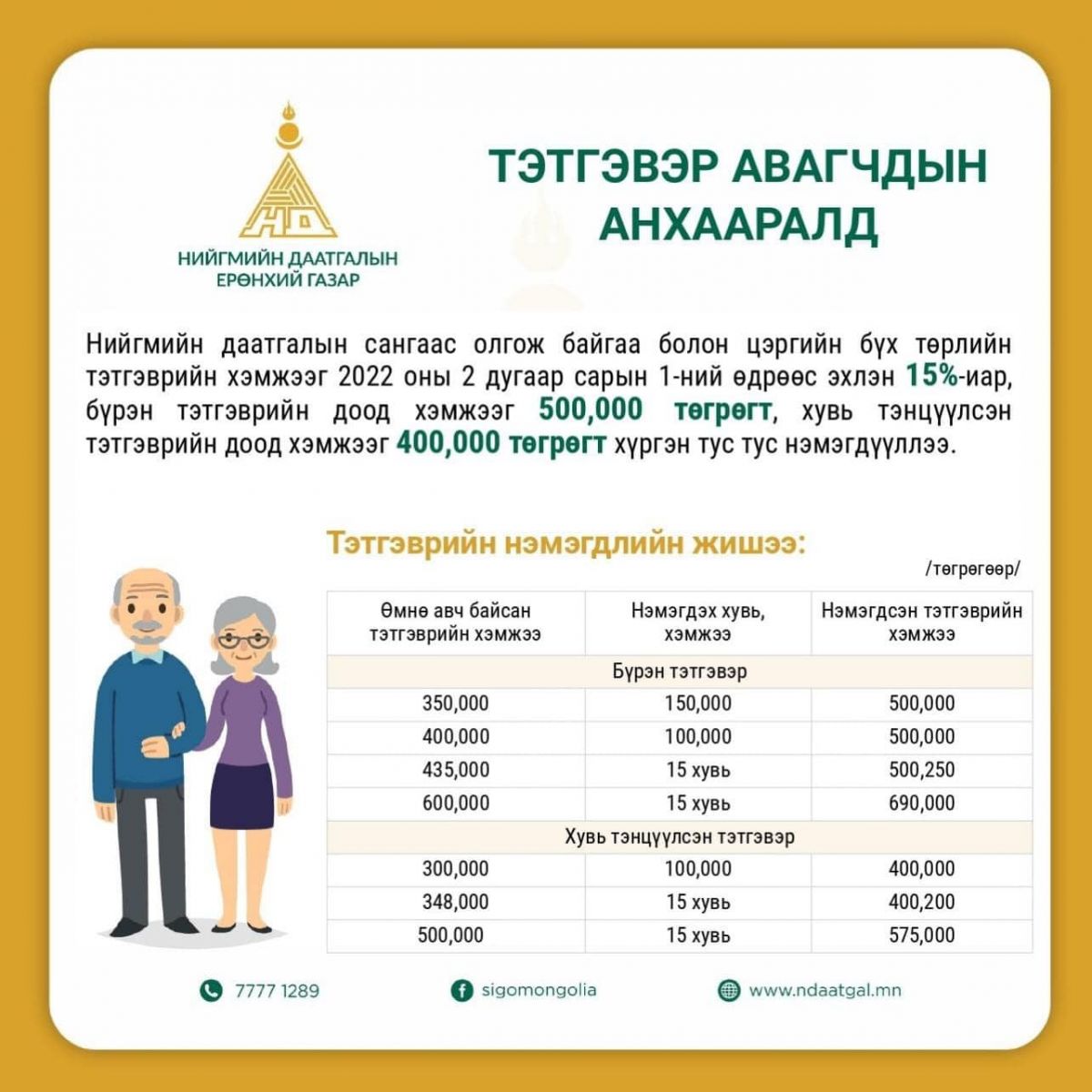Иймд дээрх хууль зүйн үндэслэл, хэрэгцээ шаардлага болон батлагдсан төсөвт үндэслэн 2022 оны 2 дугаар сарын 1-ний өдрөөс нийгмийн даатгалын сангаас олгож байгаа болон цэргийн алба хаасны тэтгэвэр авч байгаа тэтгэвэр авагчдын тэтгэврийн хэмжээг 15 хувиар нэмэгдүүлж, нийгмийн даатгалын сангаас олгох болон цэргийн алба хаасны бүрэн тэтгэврийн доод хэмжээг 500.0 мянган төгрөгөөр, нийгмийн даатгалын сангаас олгох хувь тэнцүүлэн тогтоосон тэтгэврийн доод хэмжээг 400.0 мянган төгрөгөөр шинэчлэн тогтоохоор Засгийн газраас шийдвэрлэжээ.