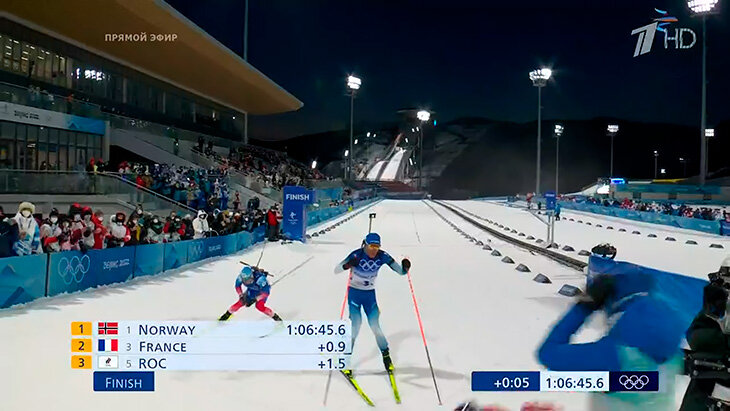 Тэмцээн эхлэхээс өмнө Норвег, Шведийн тамирчид олон нийтийн сүлжээгээр маргалдсан. Шведийн Себастьян Самуэльссон “Барианд ах дүү Бо-гийн хэн нь ч байсан ялна” гэж хэлсний хариуг Йоханнес Бо барьж, сүүлийн буудлагын дараа гурваар гарсан ч түрүүлж чадлаа. Самуэльссон сүүлийн гараанд гарсан ч 4-р байрт орсон. ОХУ-ын баг эхний хагасын дараа долоод явж байсан ч Александр Логинов оновчтой буудлагаараа эхний байрт оруулсан. Эдуард Латыпов 22 секундын тэргүүлэлтэй байсан ч гулгалтаар баригдлаа. Олимпын өмнөхөн коронавирусний халдвар авсан нь нөлөөлсөн нь мэдээж.