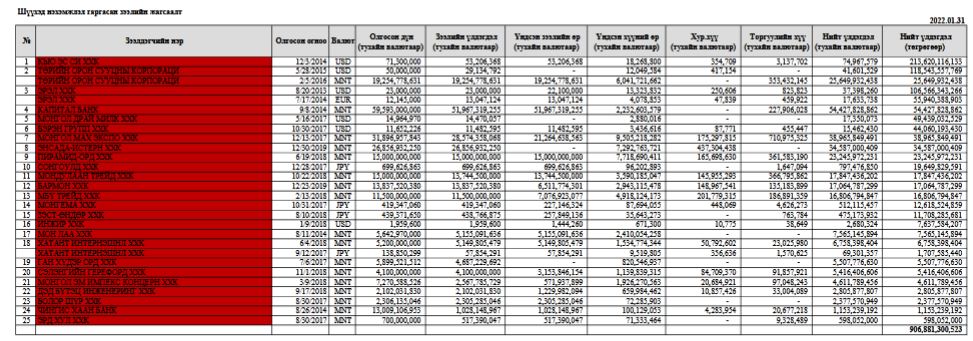 Тус банкнаас зарласан зээлдэгчийн мэдээллээс одоогийн байдлаар Шүүхэд нэхэмжлэл гаргаад буй 25 зээлийн мэдээллийг тодотгон хүргэж байна. Эдгээр зээлийн нийт дүн 906 тэрбум 881 сая төгрөг болж байна.
