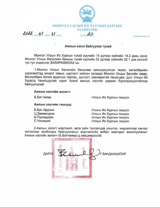 Дүйвээний үеэр УИХ-ын дарга Г.Занданшатар захирамж гаргаж Хөгжлийн банкыг шалгах ажлын хэсгийг УИХ-ын гишүүн Б.Энхбаяр, С.Чинзориг, Ц.Даваасүрэн, Б.Бат-Эрдэнэ, Б.Пүрэвдорж нарын гишүүдтэй, УИХ-ын гишүүн Б.Баттөмөрөөр ахлуулан байгуулаад байна. АТГ-тай зэрэгцэн эдгээр гишүүд шалгаж эхлэх юм байна. Эдгээрээс УИХ-ын гишүүн Б.Энхбаяр Хууль зүй, дотоод хэргийн дэд сайд байхдаа Хөгжлийн банкыг шалгах ажлын хэсгийн ахлагчаар ажиллаж байхдаа 1.3 их наяд төгрөгийн зөрчил илрүүлснээ зарлаж байсан. Тэр утгаараа Хөгжлийн банкны асуудалд бусад гишүүдээ бодвол дөнгүүр мэдээлэлтэй байх нь дамжиггүй.