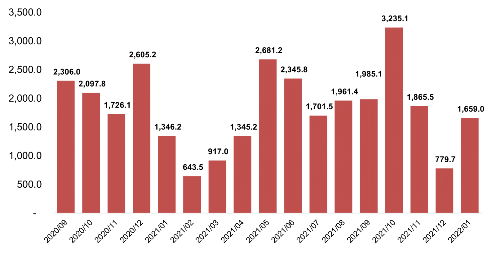 2022 оны 1 дүгээр сард Монголбанкны худалдан авсан алтны үнэ (төгрөг/грамм)
