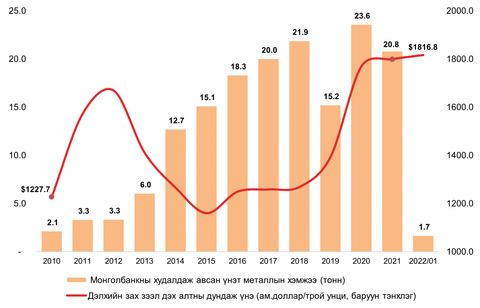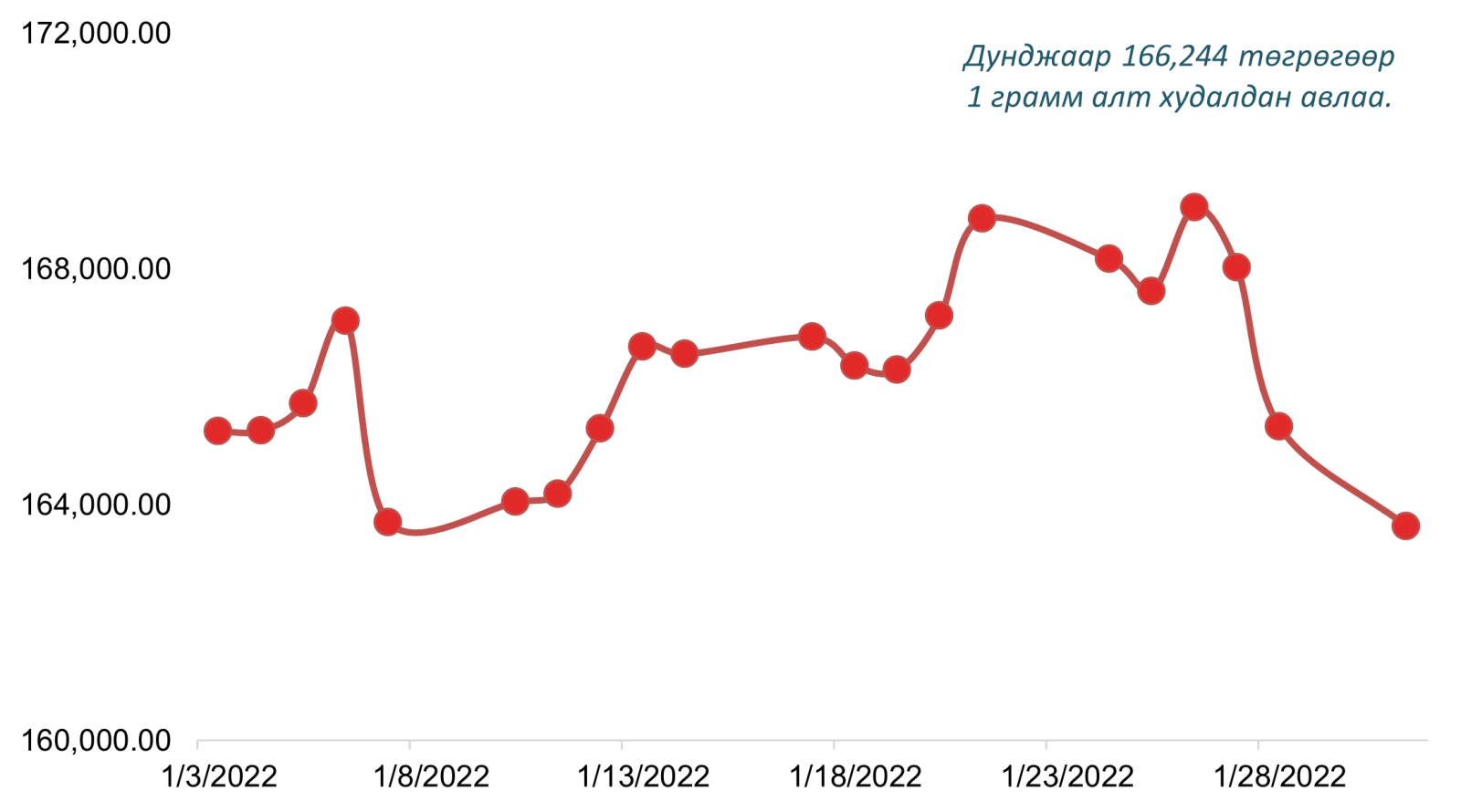 Монголбанкны 1 грамм алт худалдан авах дундаж ханш 2022 оны нэгдүгээр сард 166,244.80 төгрөг байв.