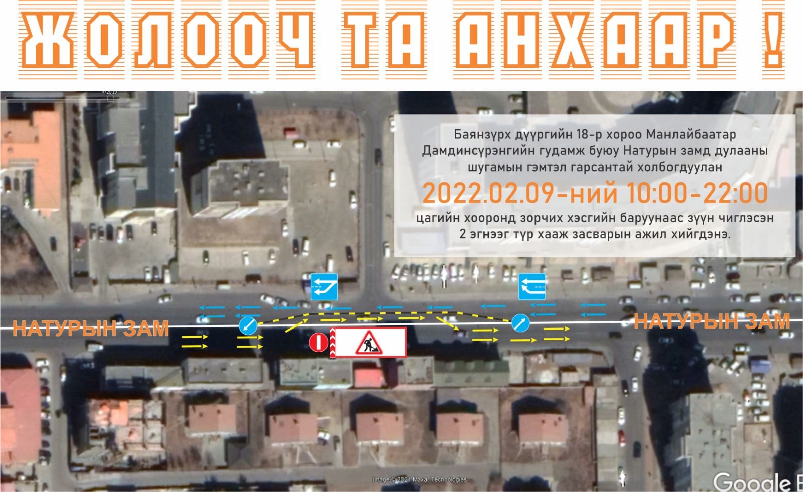Тодруулбал, Улаанбаатар хотын захирагчийн ажлын албаны өгсөн зөвшөөрлийн дагуу Баянзүрх дүүргийн 18 дугаар хороо Манлайбаатар Дамдинсүрэнгийн гудамж буюу Натурын замд дулааны шугамын гэмтэл гарсныг яаралтай засварлах шаардлагатай болсон тул өнөөдөр буюу 2022.02.09-ний 10:00-22:00 цагийн хооронд зорчих хэсгийн баруунаас зүүн чиглэлийн хоёр эгнээг түр хааж засварын ажил хийгдэх тул зургийн дагуу хөдөлгөөнд оролцоно уу.