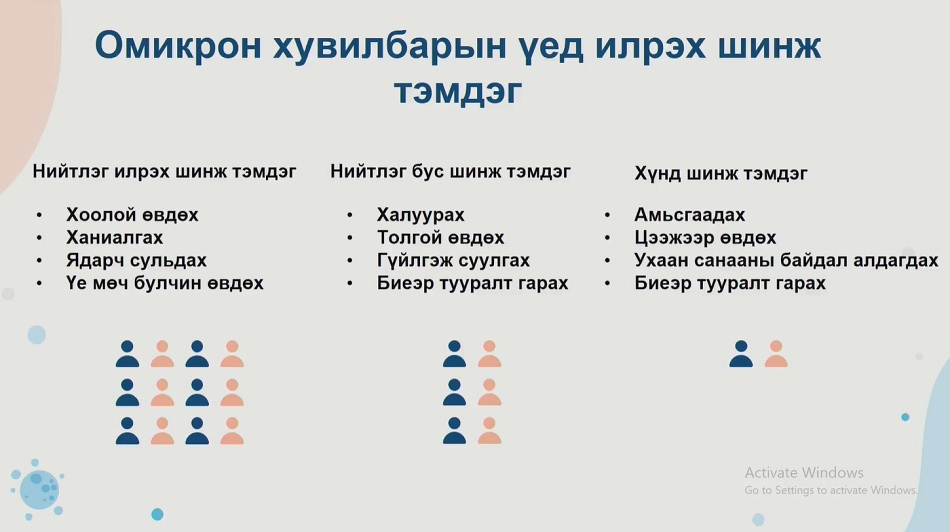 Ерөнхийдөө омикрон хувилбарын эмнэл зүйн шинж тэмдэг 5-7 хоног цочмог илэрч байна. Ялангуяа халдвар авсан залуучууд долоо хоногийн дараагаас хэвийн байдалдаа орох тохиолдлууд ажиглагдаж байна. Гэтэл өндөр настан, жирэмсэн, чихрийн шижин, зүрх судасны өвчтэй, бөөрний архаг өвчтэй, дархлаа дарангуйлагдсан, эрхтэн шилжүүлэн суулгасан хүмүүст шинж тэмдэг удаан хугацаанд үргэлжлэх, хүндрэх, зовуурь шаналгаа нь арилахгүй байх нь ажиглагдаж байна.