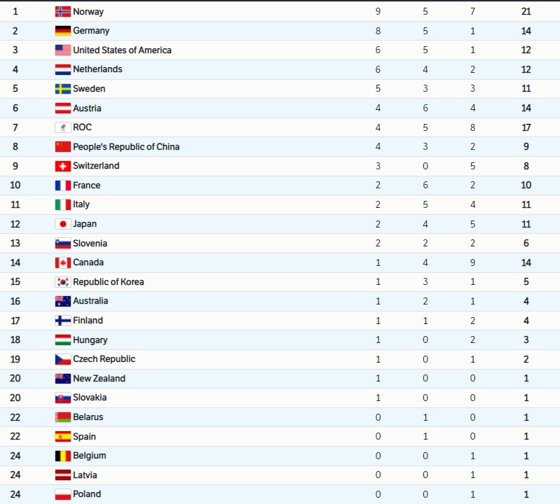 Бээжингийн олимпын наадам эхлээд 10 хонолоо. Одоогийн байдлаар өвлийн спортын их гүрэн Норвеги медалийн тоогоор итгэл төгс тэргүүлж байна. Тэдний араас Герман, АНУ-ын багууд нэхэж байгаа юм. Өнөөдөр тамирчид спортын 4 төрөлд 4 багц медалийн төлөө өрсөлдөнө.