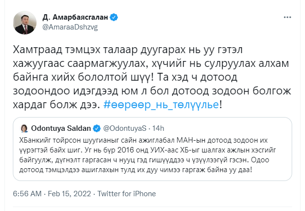 Харин МАН-ын Ерөнхий нарийн бичгийн дарга Д.Амарбаясгалан хариуг нь "Хамтраад тэмцэх талаар дуугарах нь уу гэтэл хажуугаас саармагжуулах, хүчийг нь сулруулах алхам байнга хийх бололтой шүү! Та хэд ч дотоод зодоондоо идэгдээд юм л бол дотоод зодоон болгож хардаг болж дээ" хэмээн барьжээ.