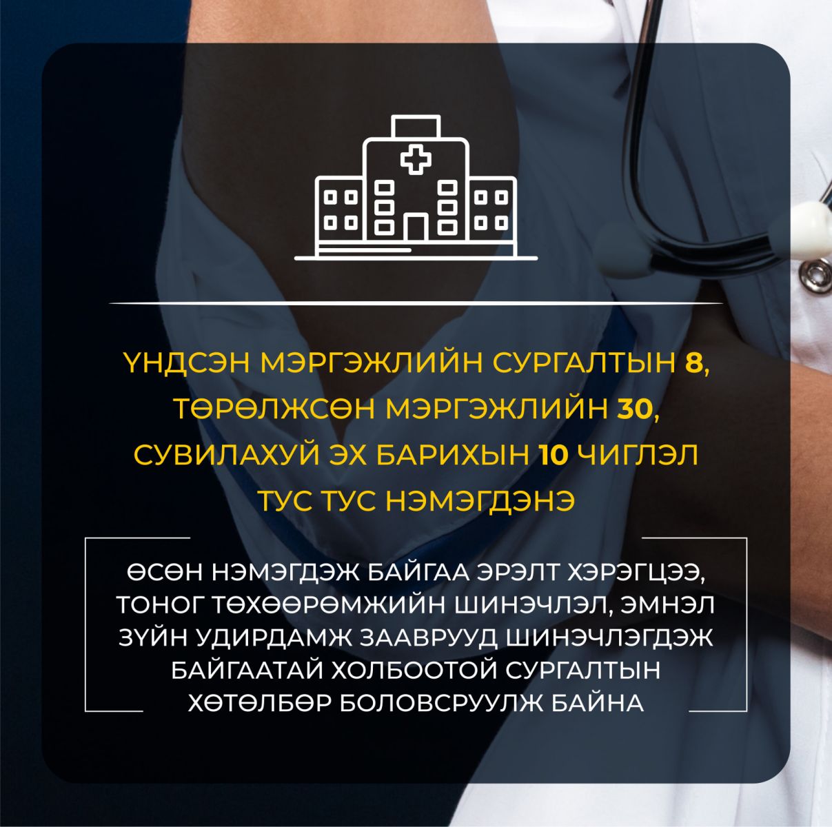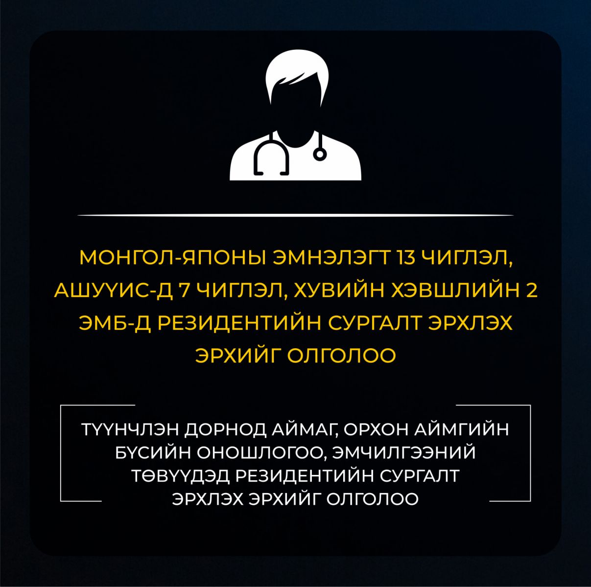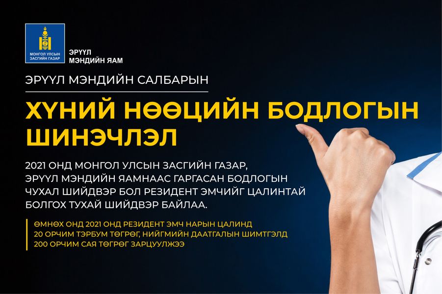 Эрүүл мэндийн салбарын хүний нөөцийн шинэчлэлийн эхлүүлж, резидент эмчийг цалинтай болгов. Мөн резидент эмч бэлтгэх сургалтын нэгдсэн хөтөлбөртэй боллоо.