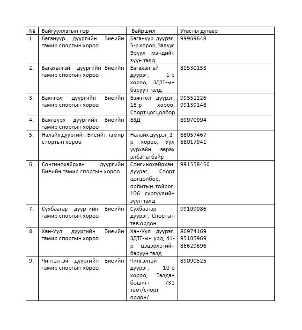 Нийслэлийн есөн дүүрэгт тогтсон цагийн хуваарийн дагуу үнэ төлбөргүй ажиллах спорт заал, танхимын байршлын мэдээллийг хүргэж байна.