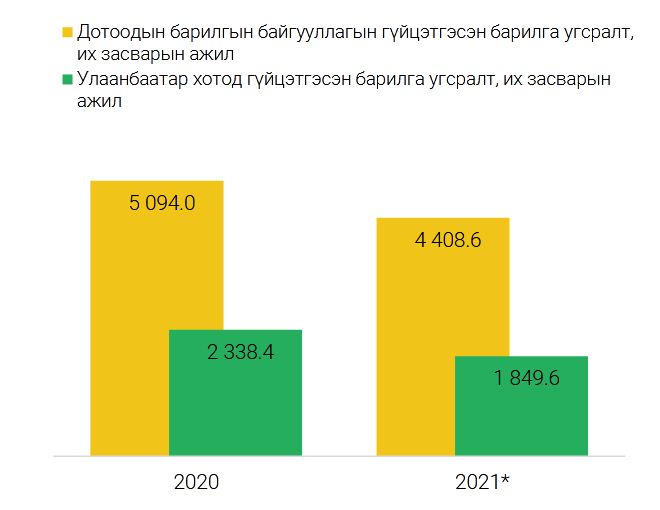 Барилга угсралт, их засварын ажил 2021 оны урьдчилсан гүйцэтгэлээр 4.5 их наяд төгрөг болсон байна. Тодруулбал, 4.4 их наяд төгрөгийн ажлыг дотоодын барилгын байгууллага, 104.6 тэрбум төгрөгийн ажлыг гадаадын барилгын байгууллага гүйцэтгэжээ.