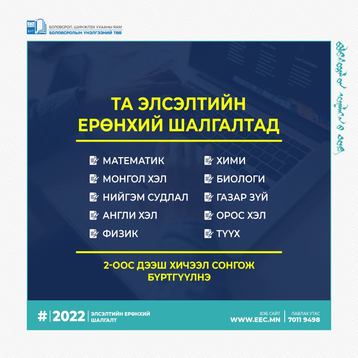 2022 оны Элсэлтийн ерөнхий шалгалтын бүртгэл https://eyesh.eec.mn/ цахим хаягаар явагдаж байна. Энэ удаагийн шалгалтын бүртгэл дөрөвдүгээр сарын 25-ны өдрийн 18:00 цагт дуусна. Бүртгэлийн хугацааг сунгахгүй ба нэмэлт бүртгэл хийхгүй гэж боловсролын үнэлгээний төвөөс мэдээллээ.