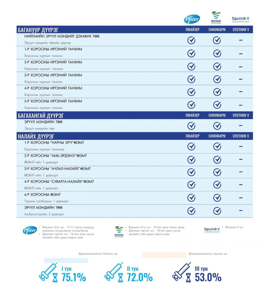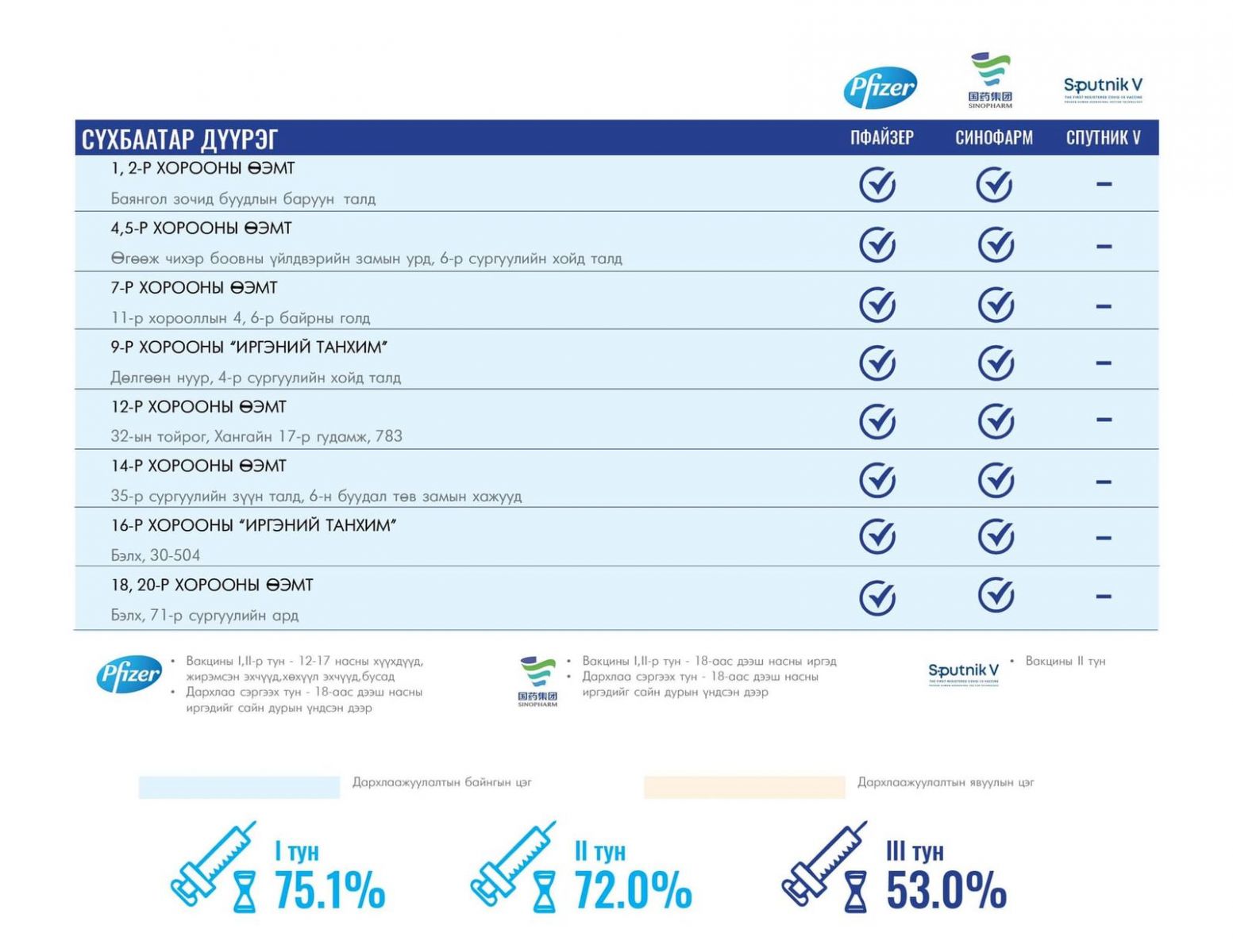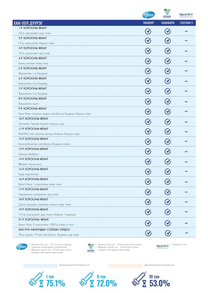 Улаанбаатар хотод өнөөдөр (2022.02.19) суурин 117 цэгт 505 эмч, ажилтан ажиллана. Дархлаажуулалтын цэгүүд 10:00-15:00 цаг хүртэл ажиллана. Нийслэлийн хэмжээнд өчигдөр I тунд 31, II тунд 54, III тунд 337, IV тунд 431, нийт 853 иргэнийг дархлаажуулсан байна. Вакцинжуулалт эхэлснээс хойш нийслэлийн зорилтот хүн амын I тунгийн хамралт 75.1 хувь, II тунгийн хамралт 72 хувь, III тунгийн хамралт 53 хувь, нэмэлт IV тунгийн хамрагдалт 5.7 хувь байна.