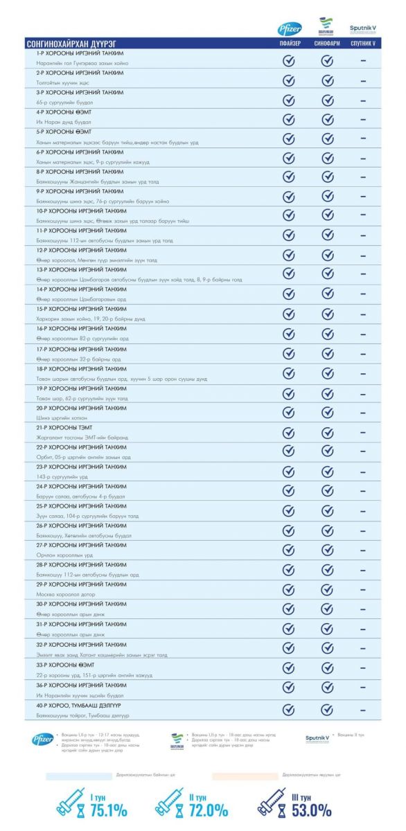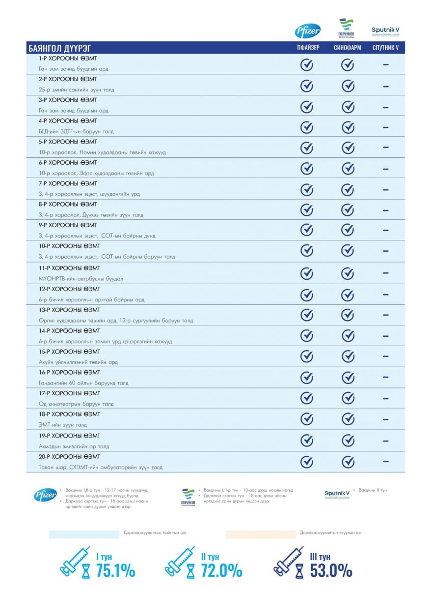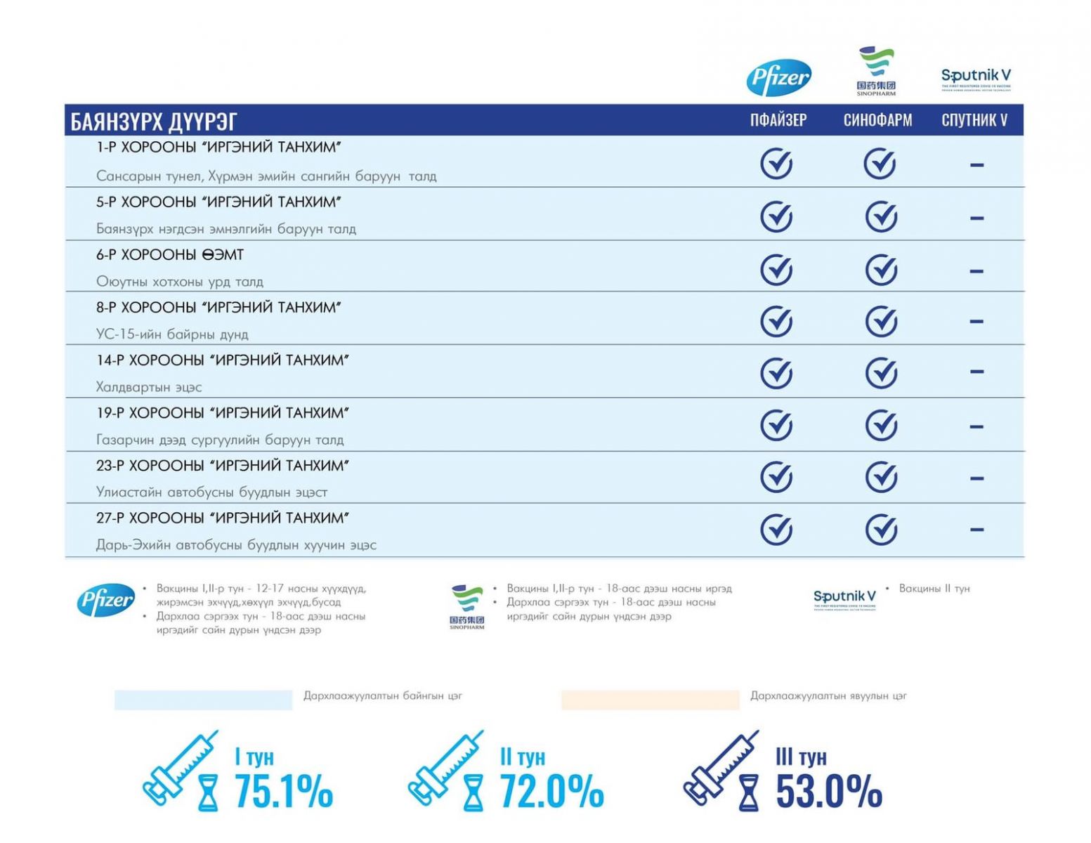 Улаанбаатар хотод өнөөдөр (2022.02.19) суурин 117 цэгт 505 эмч, ажилтан ажиллана. Дархлаажуулалтын цэгүүд 10:00-15:00 цаг хүртэл ажиллана. Нийслэлийн хэмжээнд өчигдөр I тунд 31, II тунд 54, III тунд 337, IV тунд 431, нийт 853 иргэнийг дархлаажуулсан байна. Вакцинжуулалт эхэлснээс хойш нийслэлийн зорилтот хүн амын I тунгийн хамралт 75.1 хувь, II тунгийн хамралт 72 хувь, III тунгийн хамралт 53 хувь, нэмэлт IV тунгийн хамрагдалт 5.7 хувь байна.