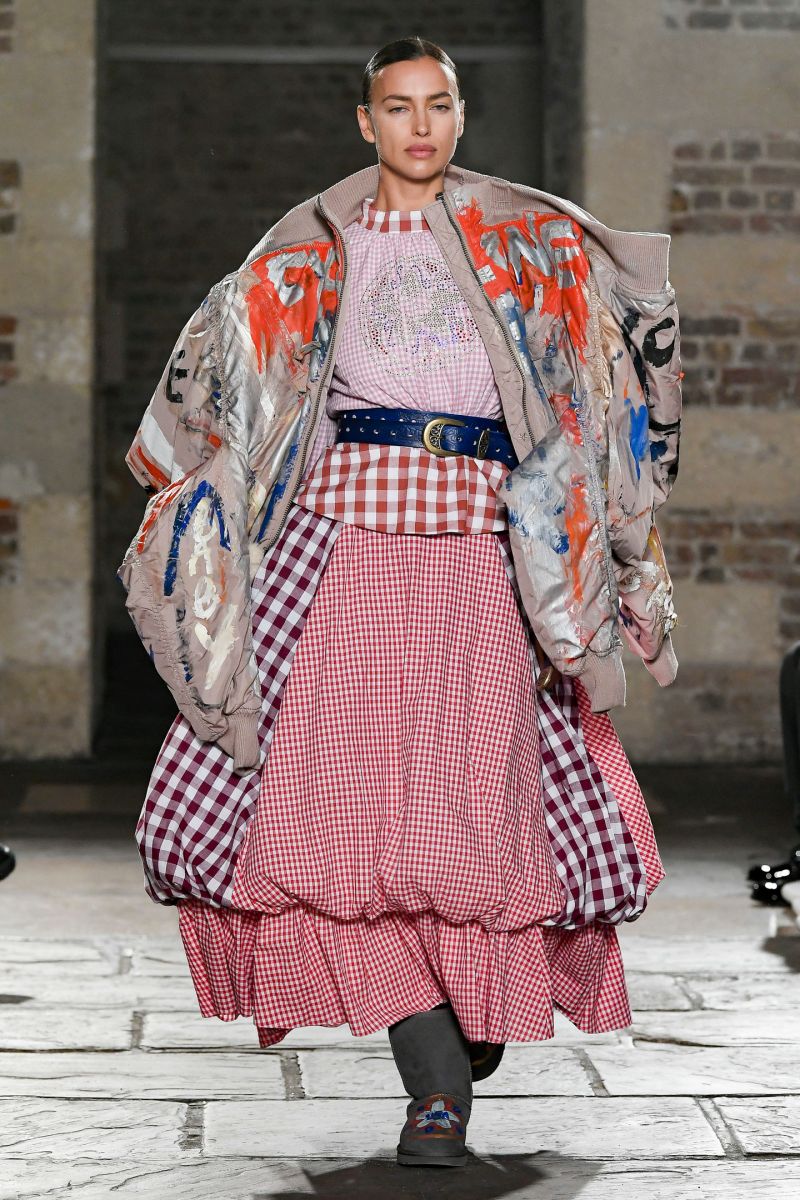 Эхлээд түүнийг Richard Quinn брэнд даавуугаар хучсан. Урт хөл, гоо сайхан биеэ гайхуулдаг Иринагаас ил үлдсэн нь нүүр л байлаа.