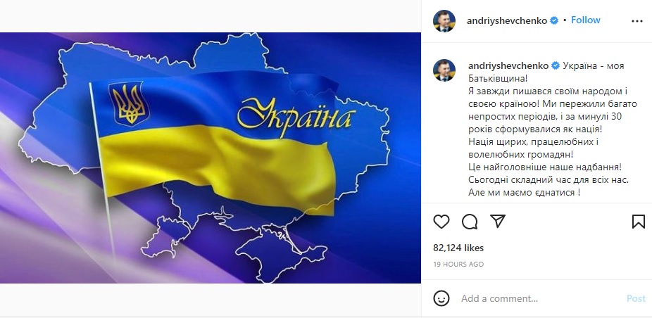 Андрей Шевченко инстаграм хуудсандаа “Украина миний эх орон. Би үргэлж өөрийн улс орон, ард түмнээр бахархдаг. Сүүлийн 30 жилд бид маш хүнд хэцүү олон зүйлийг даван гарч, улс орон, үндэстэн гэдгээ батлан харуулсан. Үнэнч шударга, хөдөлмөрч, эрх чөлөөнд дуртай ард түмэн. Энэ бол манай гол ололт, хөрөнгө. Өнөөдөр бид бүхний хувьд хэцүү үе ирээд байгаа ч бид нэгдэх ёстой. Эв нэгдэлтэй байхад бид ялна. Украин мандтугай” гэж бичжээ.