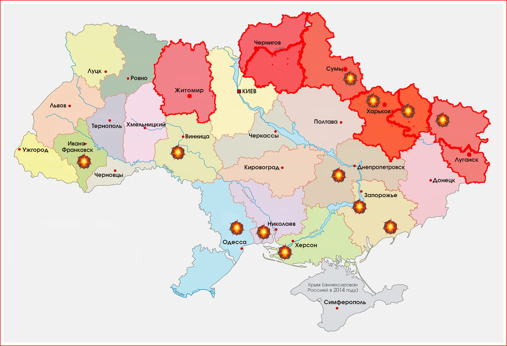 Эх сурвалжуудын мэдээлснээр Киев, Харьков, Одесса, Днепропетровск, Мариупол, Шинэ Каховка, Николаев, Чернигов хотуудад агаарын дайралт эхлээгүй ч дэлбэрэлт болж байгаа ажээ.