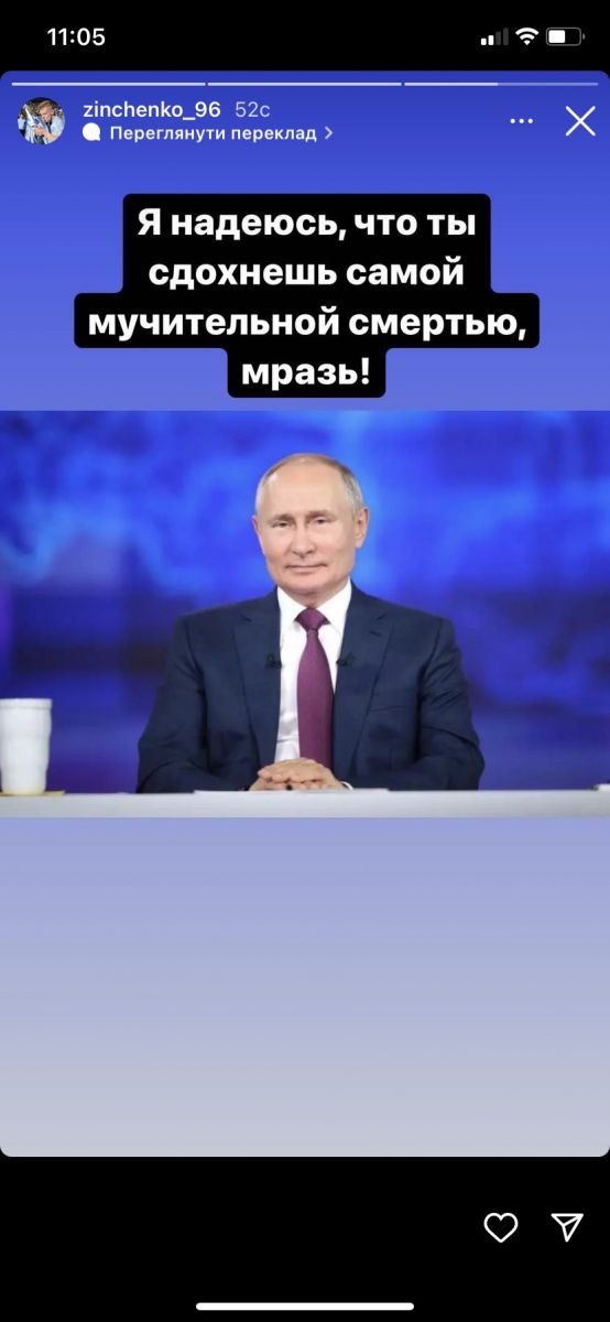 Зинченко инстаграмдаа Путины зургийг оруулан, “Өөдгүй амьтан минь, чамайг хамгийн муухайгаар зовж үхнэ гэдэгт найдаж байна” гэж бичжээ.