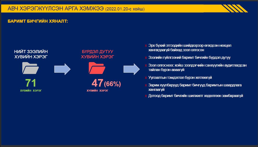 Тэгвэл нэгдүгээр сарын 20-ноос хойш өнөөдрийг хүртэлх хугацаанд Хөгжлийн банкнаас олгосон хугацаа хэтэрсэн, чанаргүй ангилалд хамруулсан нийт 52 зээл нь Хөгжлийн банкны тухай хууль, Зээлийн журам, зээлийн бодлогын баримт бичиг зэрэг хууль тогтоомжийн дагуу олгогдсон эсэх, Хөгжлийн банкны эрх бүхий албан тушаалтнууд албан үүрэг, бүрэн эрхээ урвуулан ашиглаж, зээлдэгч аж ахуйн нэгжүүдэд давуу байдал бий болгож, хууль бусаар олгосон эсэх, хахууль авч, төрд хохирол учруулсан эсэхийг тогтоохоор дээрх холбогдох байгууллагуудтай хамтран чанаргүй зээлэгчидтэй холбоотой нийт 55 удаагийн биечлэн уулзалт хийсэн байна.