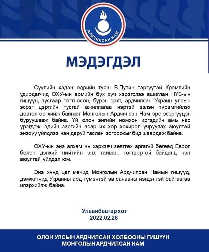 Сүүлийн хэдэн өдрийн турш В.Путин тэргүүтэй Кремлийн удирдагчид ОХУ-ын армийн бүх хүч хэрэгслээ ашиглан НҮБ-ын гишүүн, тусгаар тогтносон, бүрэн эрхт, ардчилсан Украин улсын эсрэг цэргийн тусгай ажиллагаа нэртэй эзлэн түрэмгийлэх довтолгоо хийж байгааг Монголын Ардчилсан Нам эрс эсэргүүцэн буруушааж байна.
