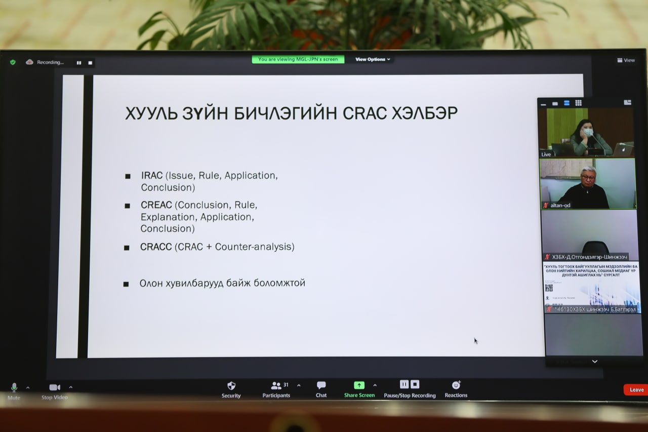 Хууль зүйн бичлэгийн хэв маяг, арга техникийн үндсэн ойлголт, англи хэлний хууль зүйн нэр томъёоны хэрэглээ, орчуулгын арга зүй, хууль зүйн англи хэлний бичгийн болон бусад чадварыг хөгжүүлэх зорилготой тус сургалтад Улсын Их Хурлын Тамгын газрын ажилтнууд, Улсын Их Хурал дахь намын бүлгийн ажлын албаны ажилтнууд, Улсын Их Хурлын гишүүний ажлын албаны ажилтнууд танхимаар болон цахимаар хамрагдлаа гэж Улсын Их Хурлын Хэвлэл мэдээлэл, олон нийттэй харилцах хэлтсээс мэдээлэв.
