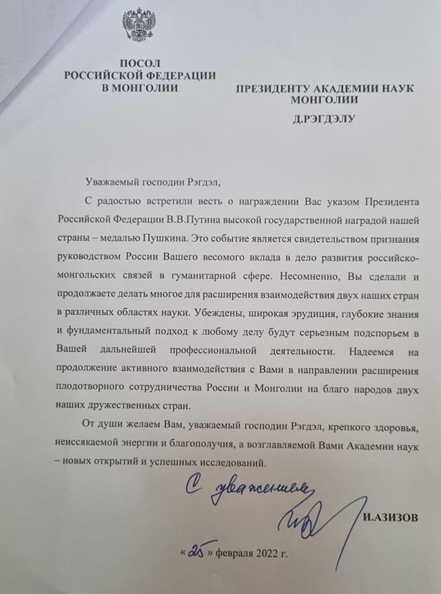 Энэ тухай ОХУ-аас Монгол Улсад суугаа Онц бөгөөд Бүрэн эрхт Элчин сайд И.К.Азизов ШУА-ийн ерөнхийлөгчид албан захидал илгээж “Энэхүү үйл явдал нь хүмүүнлэгийн салбарт Орос-Монголын харилцааг хөгжүүлэхэд оруулсан хувь нэмрийг тань ОХУ-ын удирдлага хүлээн зөвшөөрсний нотологоо боллоо. Хоёр орны шинжлэх ухааны олон салбарын хамтын ажиллагааг өргөжүүлэх талаар ихээхэн зүйл хийсэн, цаашид ч үргэлжлүүлэх нь дамжиггүй юм. Таны аливаа чиглэлийн өргөн, гүнзгий мэдлэг, суурь хандлага нь цаашдын мэргэжлийн үйл ажиллагаанд тань түлхэц болно гэдэгт итгэлтэй байна” гэжээ.