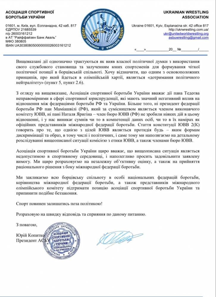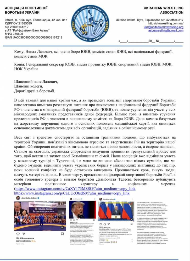 Украины бөхийн холбооноос ДБНХ-нд хандан, ОХУ-ын Спорт бөхийн холбооны гишүүнчлэлийг цуцлахыг шаарджээ.