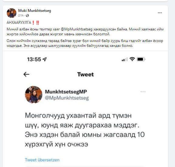 Тэрбээр "Миний албан ёсны твиттер хаяг @MpMunkhtsetseg хакердуулсан байна. Миний хаягнаас ийм жиргээ хийснийхээ дараа жиргээг маань хаачихсан бололтой. Олон нийтийн сүлжээнд тараад байгаа зураг бол миний байр суурь биш гэдгийг албан ёсоор мэдэгдье. Энэ асуудлаар шалгуулахаар хуулийн байгууллагад хандах болно" хэмээн байр сууриа илэрхийлсэн байна.