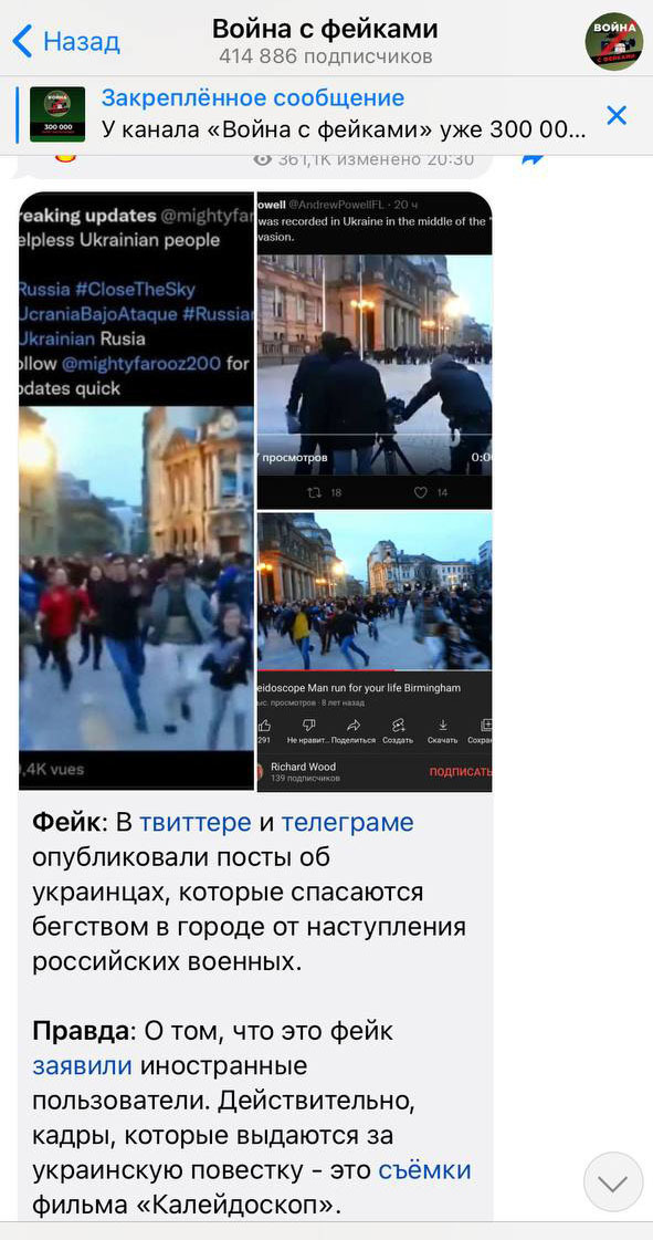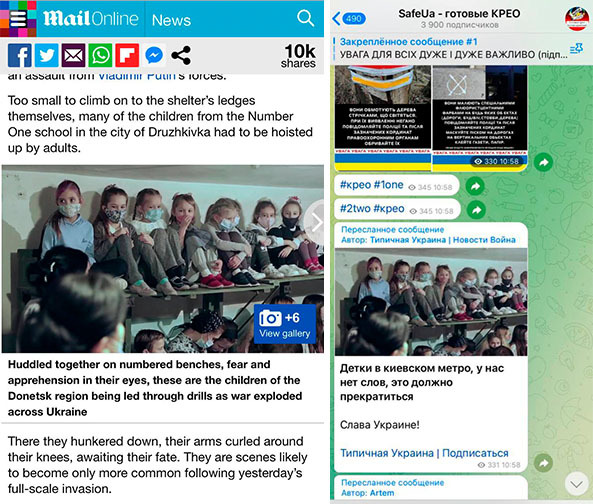 Киевийн оршин суугчдын агаарын цохилтоос зугтааж буй дүрс бичлэг нь найман жилийн өмнө Их Британийн Бирмингемд авсан “Kaleidoscope” киноны хэсэг болохыг илчилсэн байна. Харин Оросын цэргийн ажиллагааны улмаас Киев хот сүйрч буйг харуулах зорилготой метронд хорогдож буй хүүхдүүдийн гэрэл үнэндээ Донецк мужийн Дружовкт авсан байжээ. Эл гэрэл зургийг анх Их Британийн “Daily Mail” нийтэлж байсан бол хожим нь бусад хэвлэлүүд “Киевийн метронд” тайлбартайгаар түгээсэн байна.