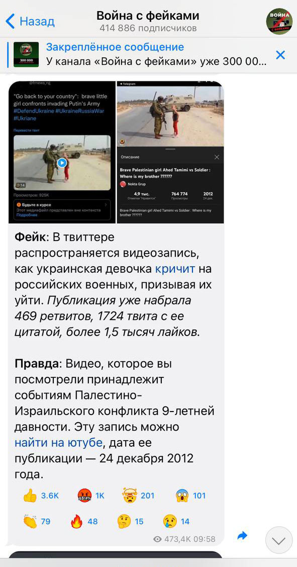 Бяцхан охин танкны өмнө зогсох цэрэг рүү орилж буй дүрс бичлэг Украин болон Оросын цэргийн ажиллагаатай ямар ч холбоогүй гэнэ. Энэ бичлэгийг есөн жилийн өмнө Палестин, Израилийн мөргөлдөөний үеэр хийсэн болохыг мөн баталжээ. Үүнээс гадна хил орчмын хот, мужуудыг бөмбөгдөж, иргэдийг нь нүүлгэн шилжүүлж байгаа тухай хуурамч мэдээлэл их түгээж байна.