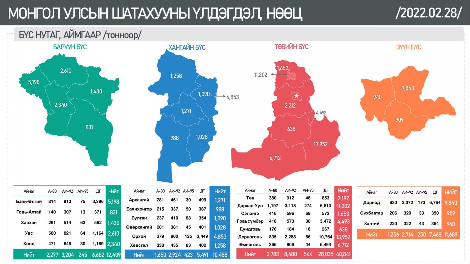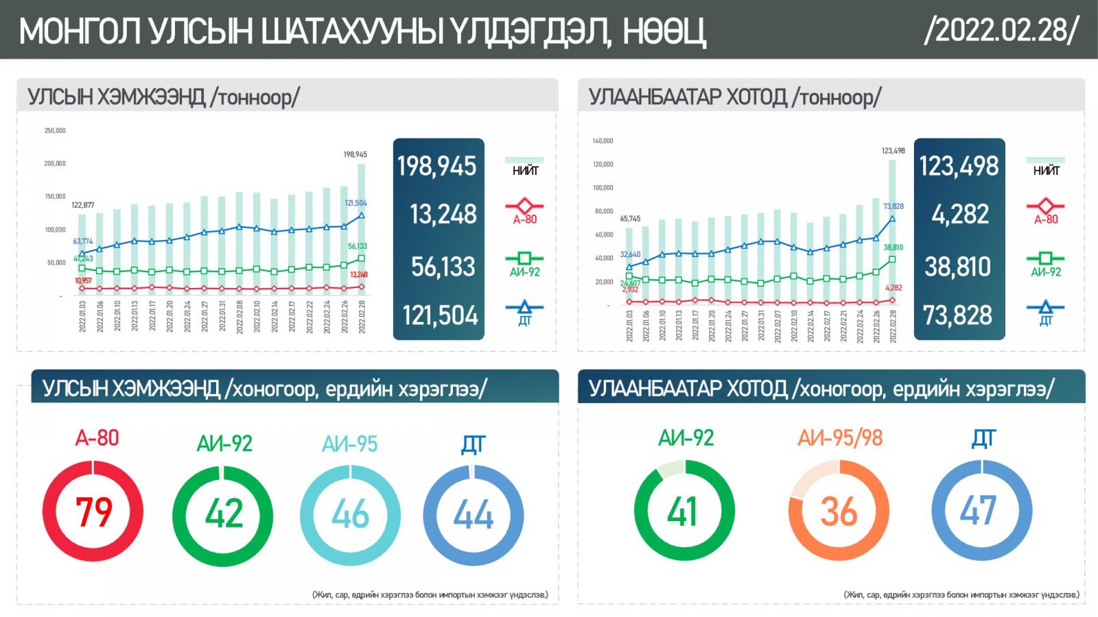 УУХҮЯ-ны мэдээллээр улсын хэмжээнд энэ сарын 28-ны өдрийн байдлаар нийт 198,945 тонн шатахууны нөөцтэй байгаагаас А-80 автобензин 13,248 тонн, АИ-92 автобензин 56,133 тонн, ДТ 121,504 тонн байна. Хоногийн хэрэглээгээр авч үзвэл, АИ-92 автобензиний 42, АИ-95 автобензиний 46, А-80 автобензиний 79, ДТ-ний 44 хоногийн нөөц байгаа аж.