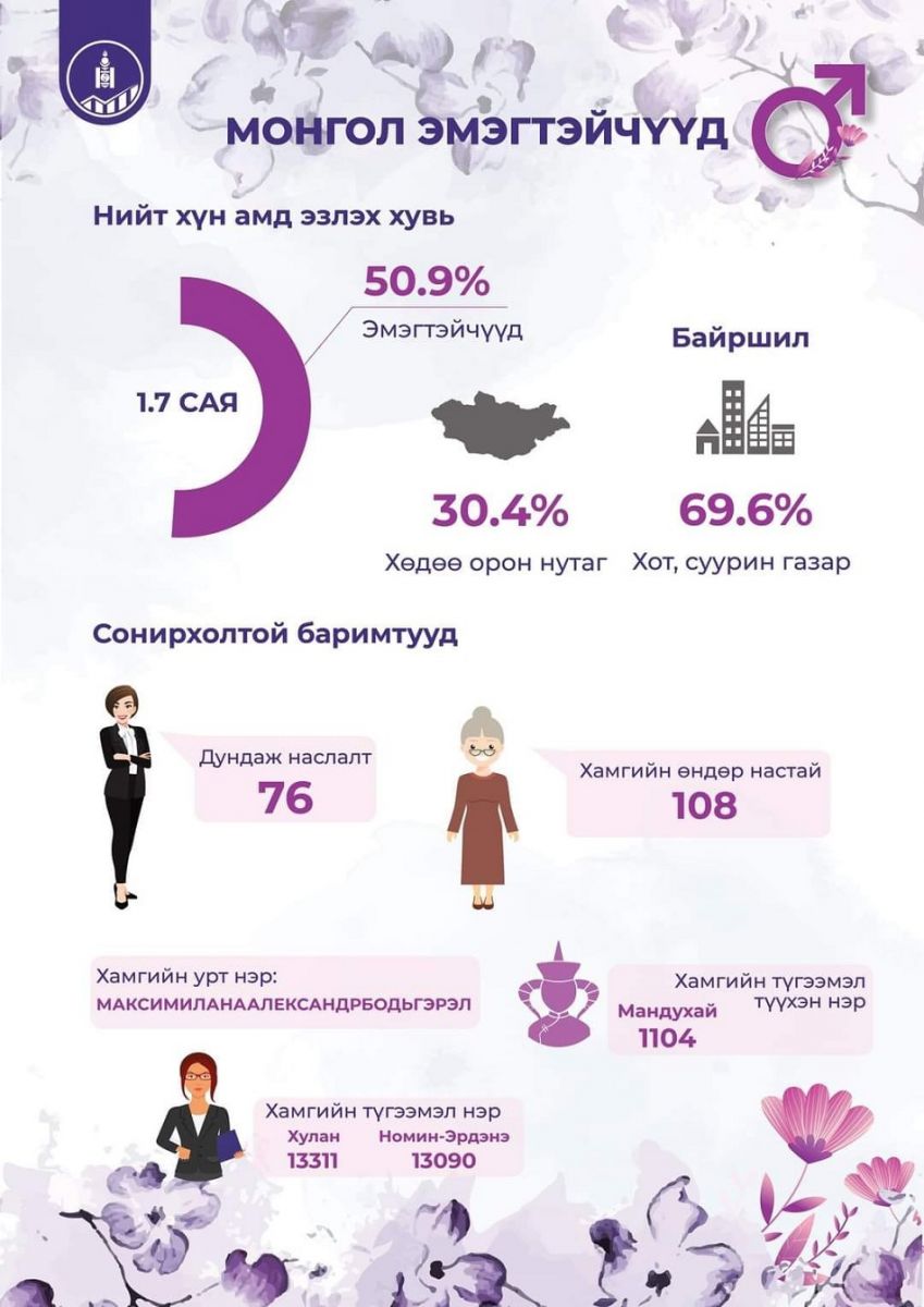 Монгол эмэгтэйчүүдийн дундаж наслалт 76. Үүнийг эрэгтэйчүүдийн дундаж наслалттай харьцуулахад 9.5 жилээр урт байна.