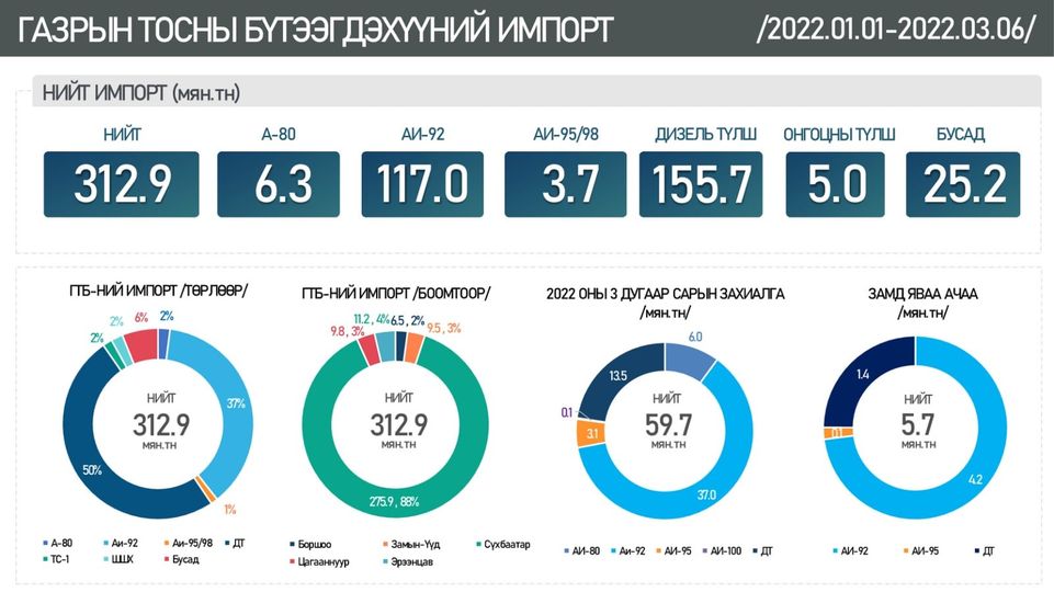 Манай улс он гарсаар нийт 312.9 мянган тонн газрын тосны бүтээгдэхүүн импортолсон. Үүнд А-80 автобензин 6.3 мянган тонн, АИ-92 автобензин 117.0 мянган тонн, АИ-95/98 автобензин 3.7 мянган тонн, дизелийн түлш 155.7 мянган тонн, онгоцны түлш 5.0 мянган тонн, бусад бүтээгдэхүүн 25.2 мянган тонныг эзэлжээ.