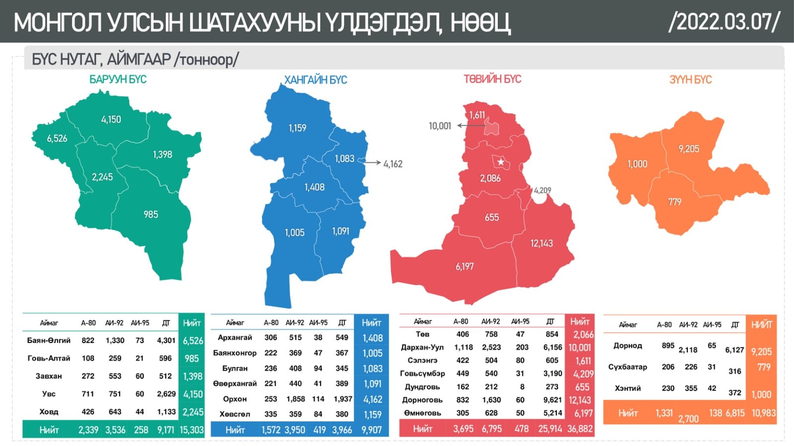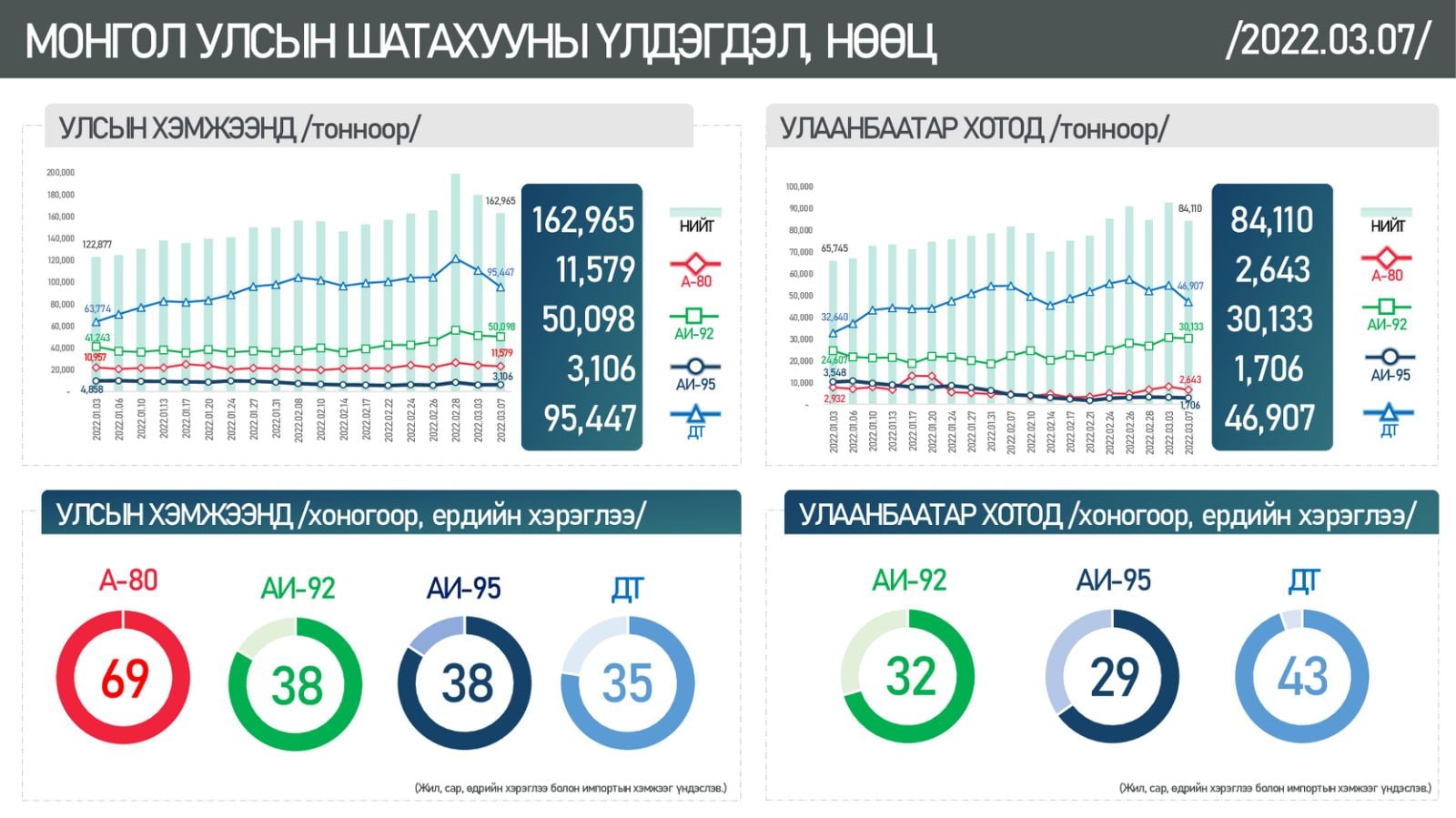 Улаанбаатар хотын хэмжээнд нийт 84,110 тонн буюу АИ-92 автобензин 32, АИ-95 автобензин 29, дизелийн түлшний 43 хоног буюу хэвийн нөөцтэй байна.