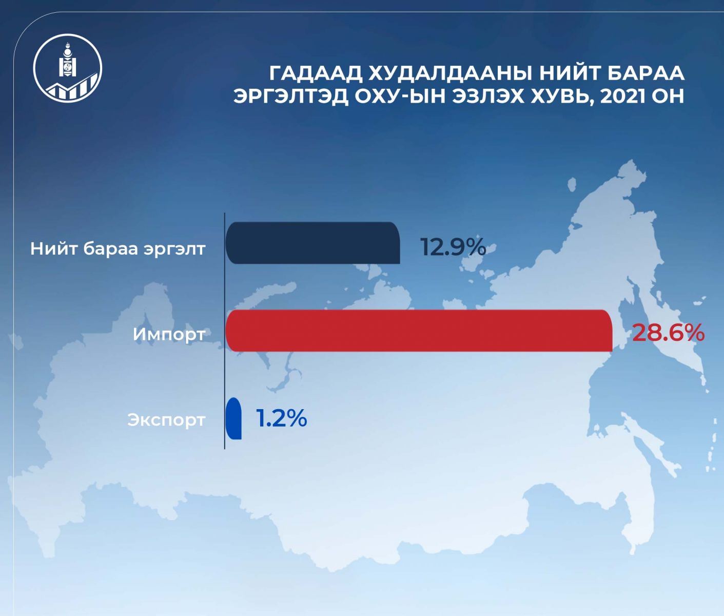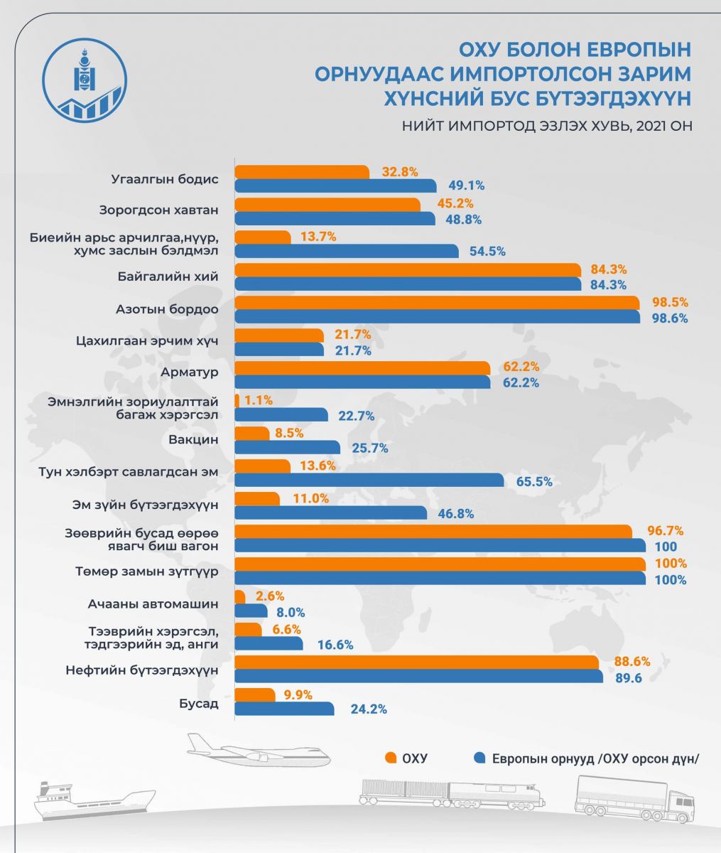 Монгол Улс 2021 онд хүнсний бус бараа бүтээгдэхүүний импортод 5.9 тэрбум ам.доллар зарцуулжээ. Тэгвэл энэ дүнгийн 38.4 хувийг европын орнууд, үүнээс 27.5 хувийг ОХУ бүрдүүлжээ.